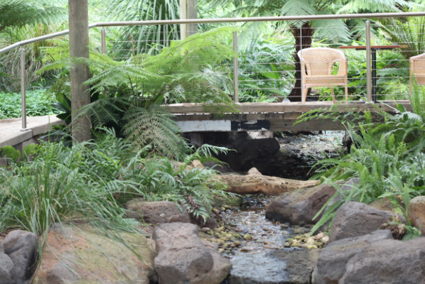 The Rainforest at the Wild Food Farm is Phillip Island’s most unique event space. It’s a lush indoor garden of tall tree ferns and a thriving understory of ground covers and delicate ferns and flowers. A cascading stream tumbles over stones and under picturesque bridges, before ending its journey in a huge rock-pool.